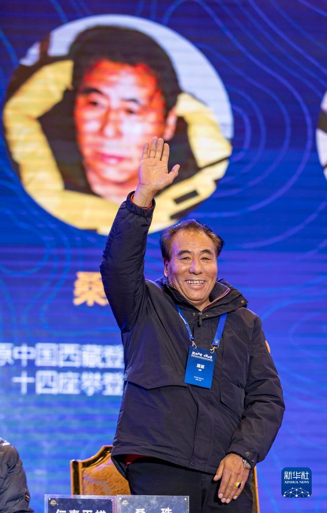 12月11日,原西藏登山隊登頂世界十四座海拔8000米以上高峰探險隊隊長桑珠在交流大會上向觀眾致意。