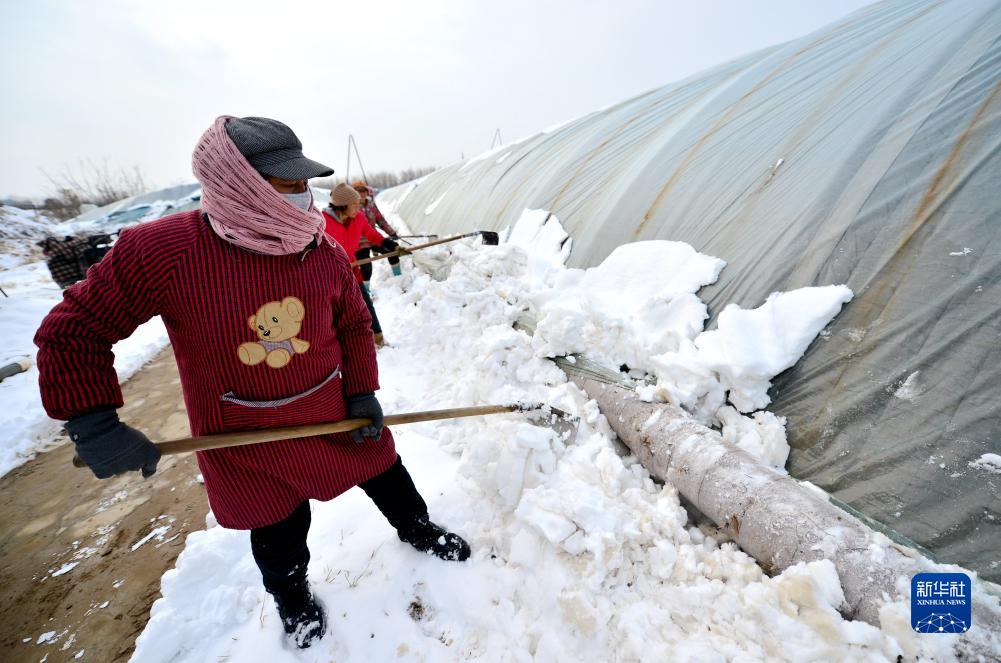 12月11日,石家莊市欒城區崗頭村種植戶在清理大棚上的積雪。