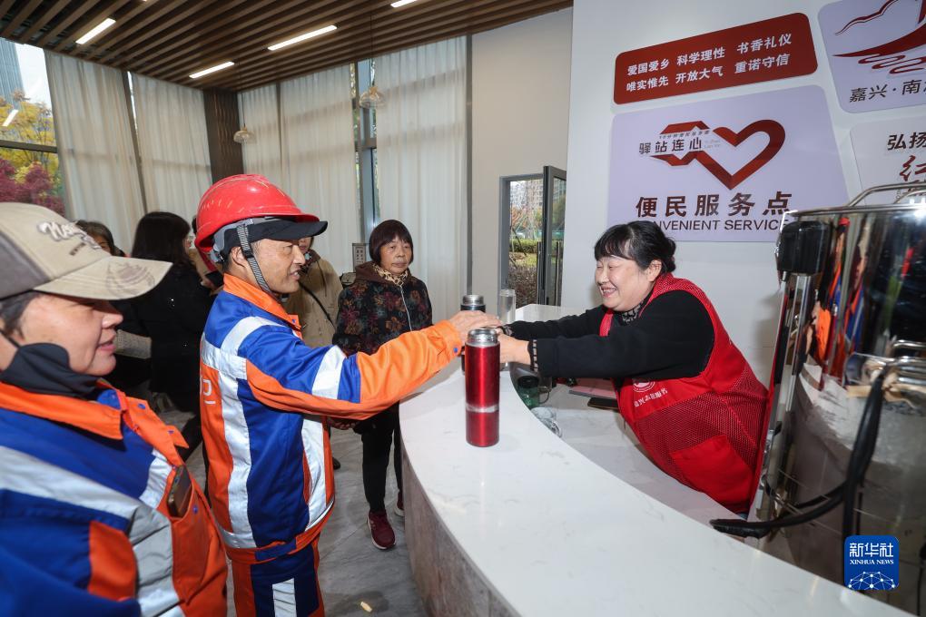 12月12日,在浙江省嘉興市南湖區的“禾城驛·溫暖嘉”連心驛站,志願者為環衛工人等戶外工作者提供熱豆漿,該驛站近期每天早上向戶外工作者免費提供100多杯熱豆漿。