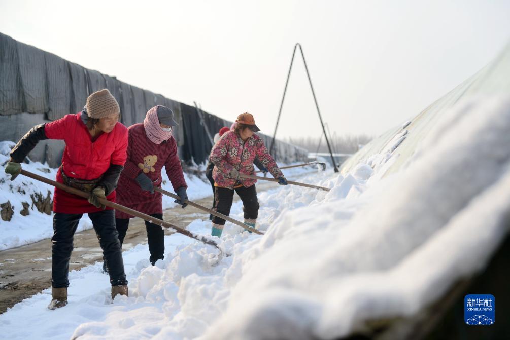 12月11日,在河北省石家莊市欒城區崗頭村,種植戶在清理大棚上的積雪。