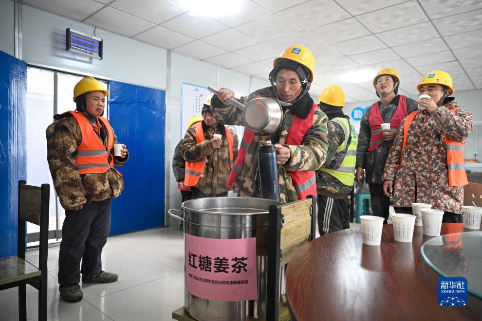 12月12日,在中建二局北方公司天津泰康項目工地,工人在飲用為他們準備的紅糖薑茶驅寒。