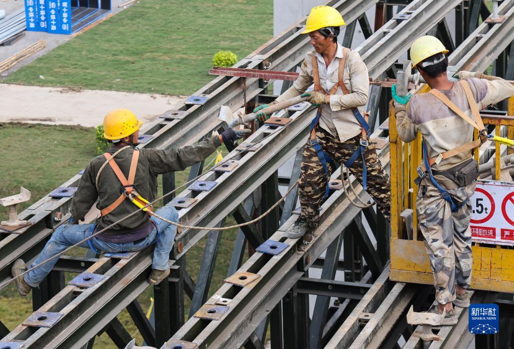 12月12日,施工人員在深江鐵路廣中江特大橋南沙站橋段進行現澆梁支架安裝。