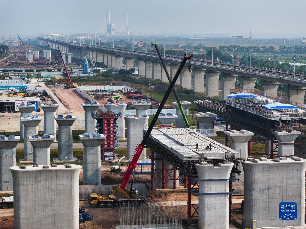 12月12日,施工人員在深江鐵路廣中江特大橋南沙站橋段作業(無人機照片)。