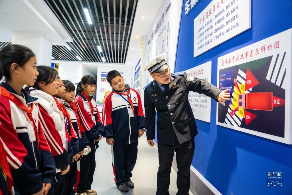 12月12日,在瀏陽市交通安全宣傳教育實踐基地,民警給學生講解貨車視野盲區。