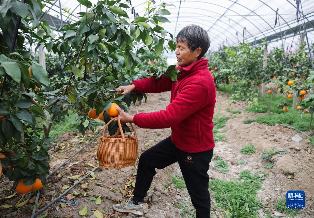 12月12日,在南湖區余新鎮壹嘉億農業種植基地內,村民朱玲珍在採摘“紅美人”柑橘。