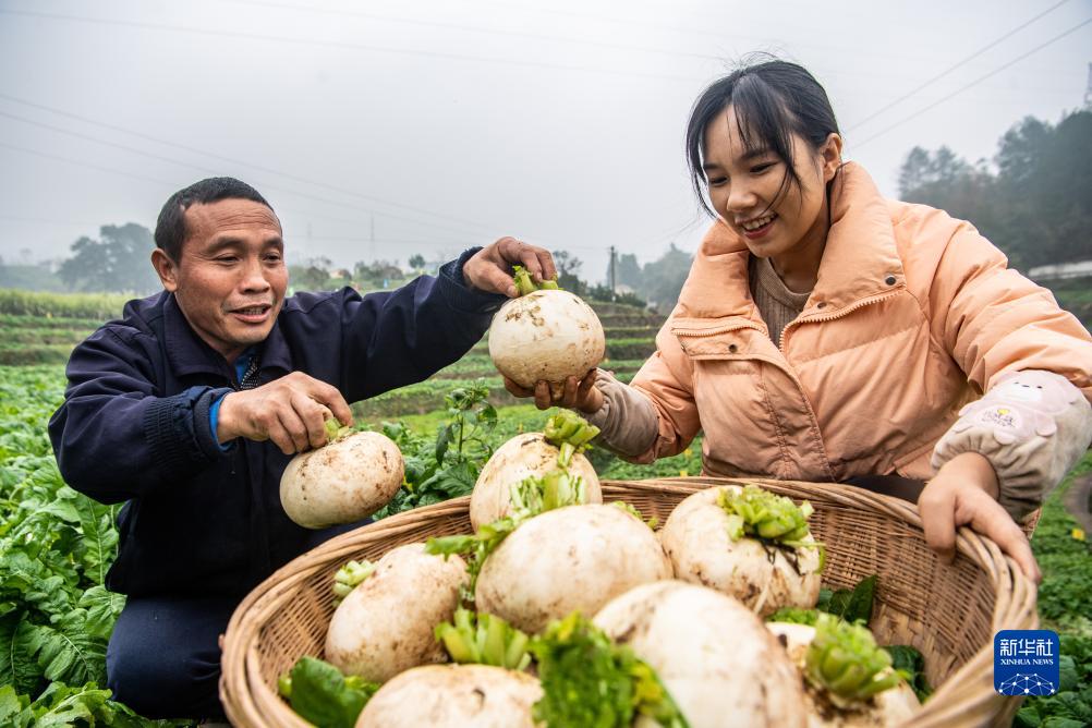12月12日,在重慶市綦江區趕水鎮石房村趕水蘿蔔種植園內,種植戶在田地裏收穫蘿蔔。