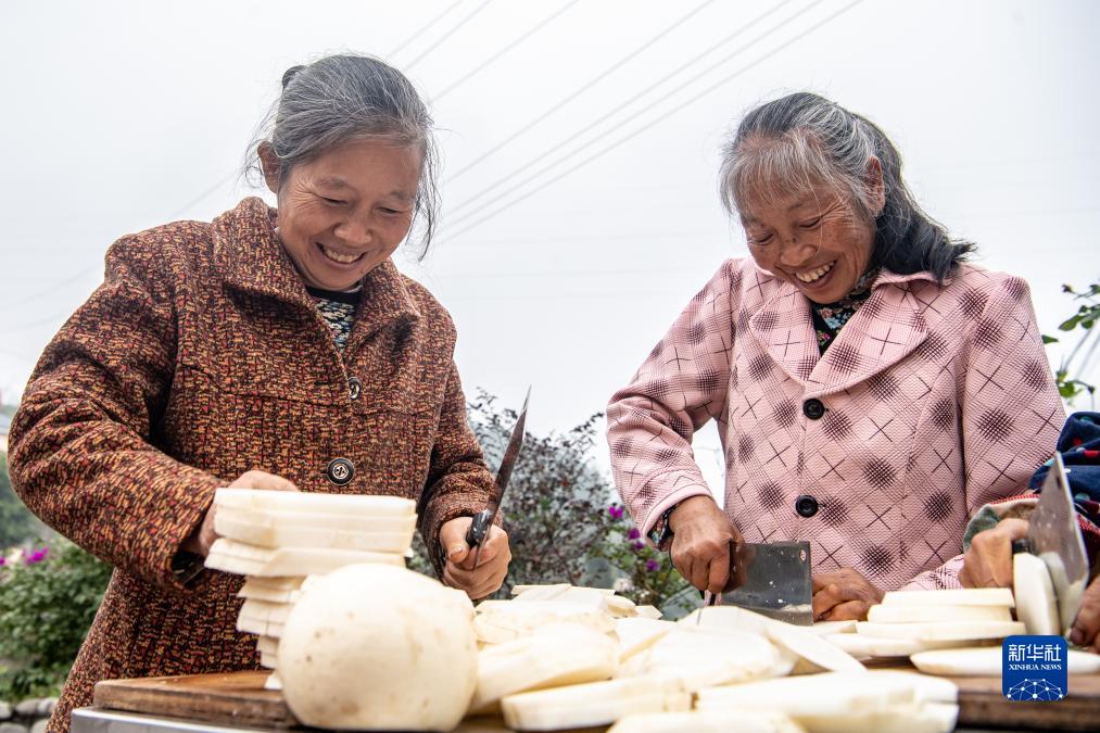12月12日,在重慶市綦江區趕水鎮石房村趕水蘿蔔種植園內,農戶在切蘿蔔。