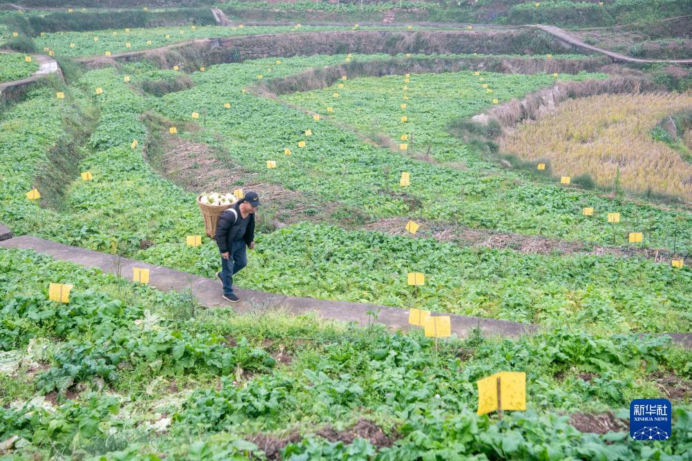 12月12日,在重慶市綦江區趕水鎮石房村趕水蘿蔔種植園內,種植戶背着收穫的蘿蔔行走在田間。