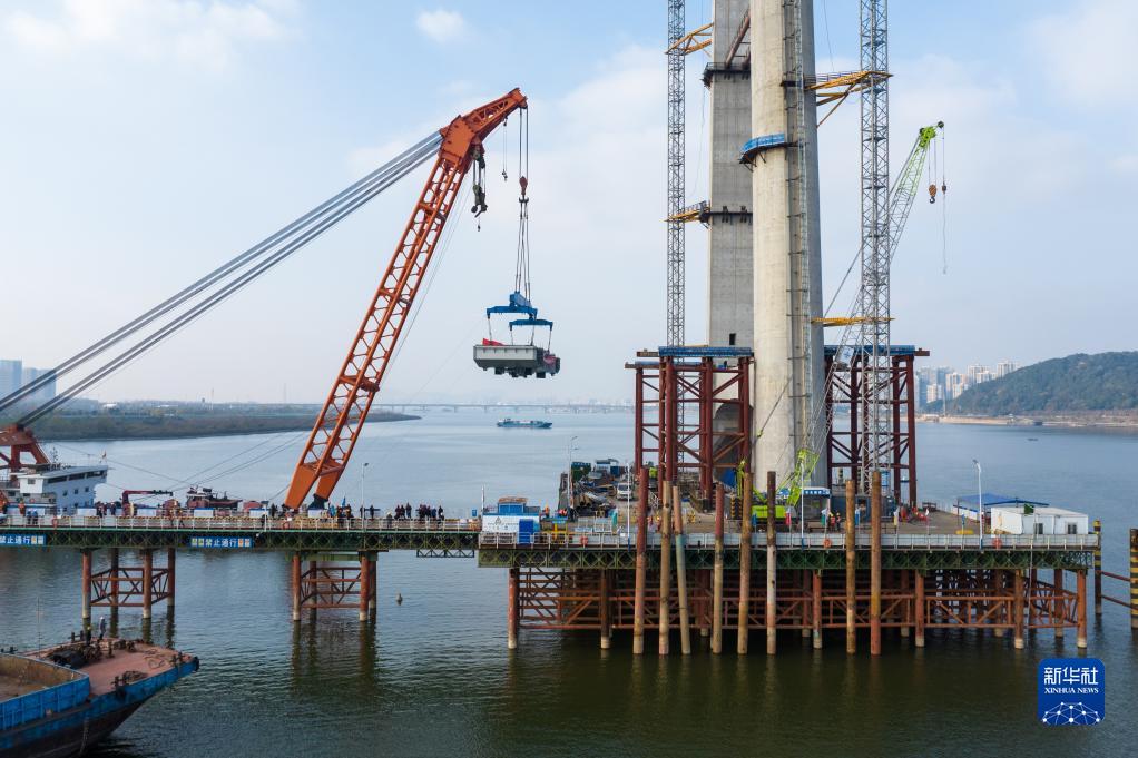 這是12月12日在長沙興聯路大通道項目拍攝的雙塔斜拉橋首段主梁架設施工現場(無人機照片)。