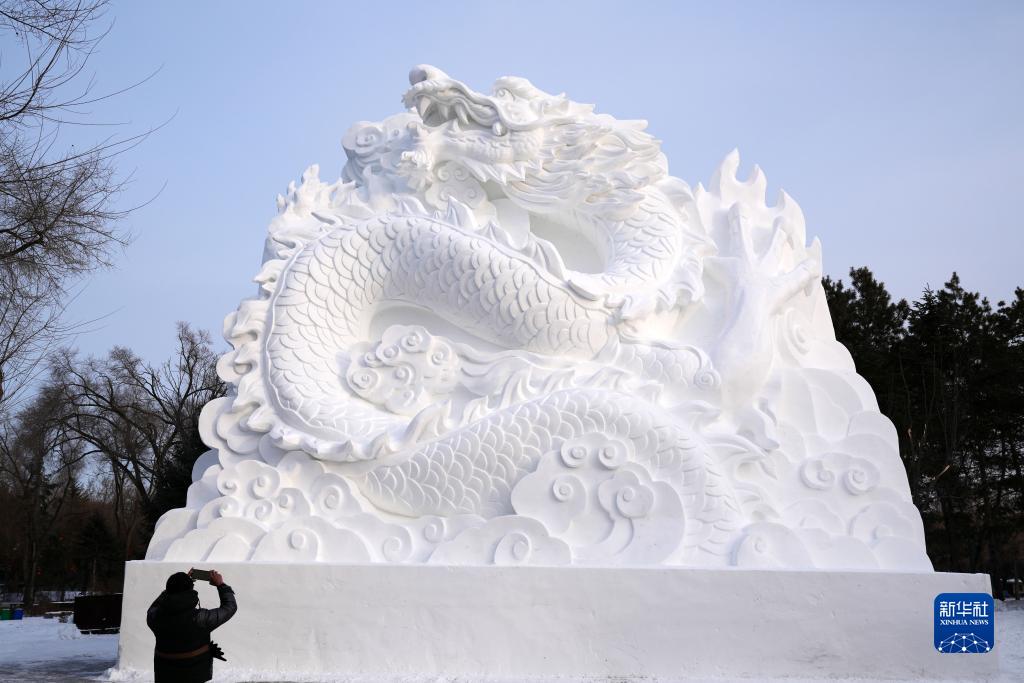 12月12日,在哈爾濱太陽島雪博會園區,一名雪雕師在給雪雕作品《龍騰福山》拍照。