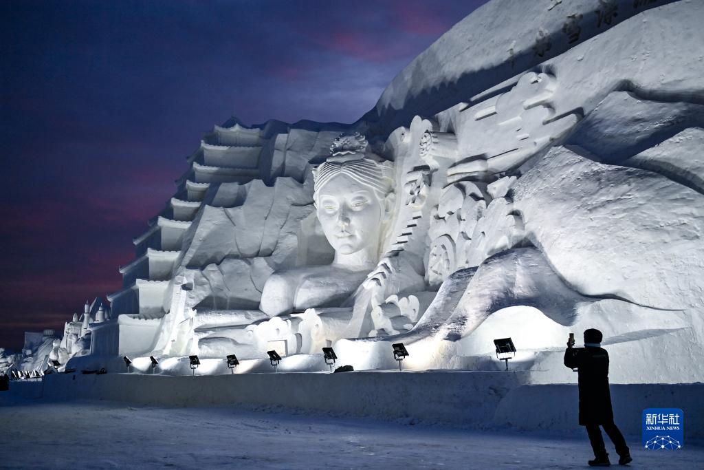 12月12日,游客在長春冰雪新天地一處雪雕前拍照。