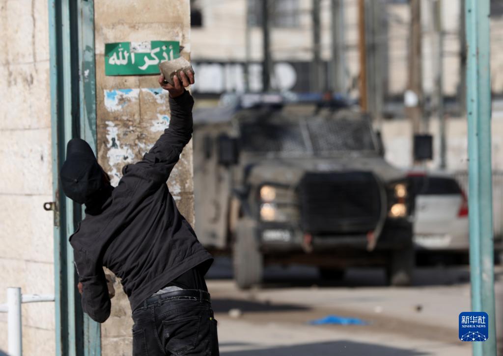 12月12日,在約旦河西岸城市傑寧,一名巴勒斯坦人向以色列軍車投擲石塊。