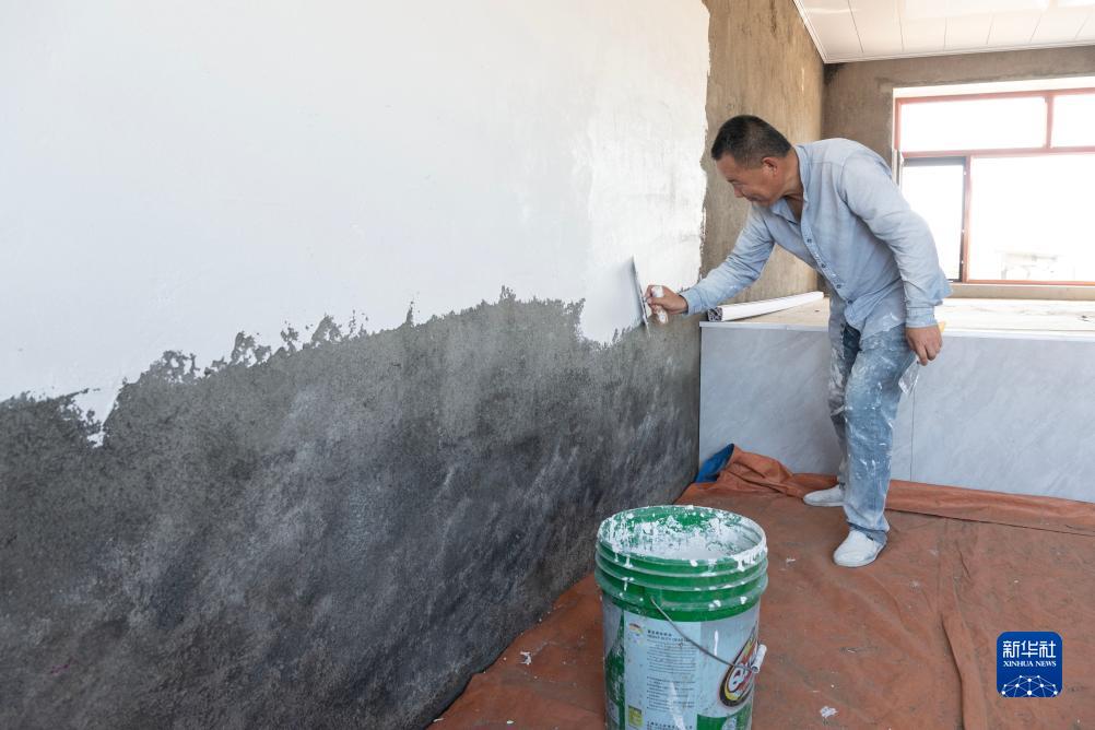 在黑龍江省尚志市老街基鄉龍王廟村,施工人員在粉刷村民楊春貴家的受損房屋(9月7日攝)。