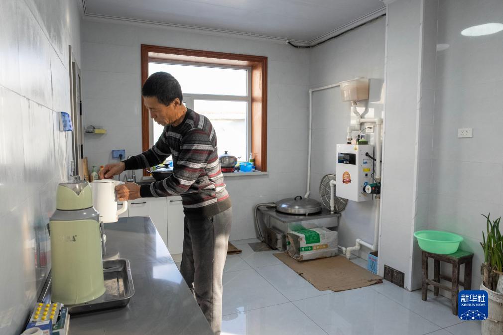 12月12日,在黑龍江省尚志市老街基鄉基豐村,村民劉環茂在新建成的房屋裏做家務。