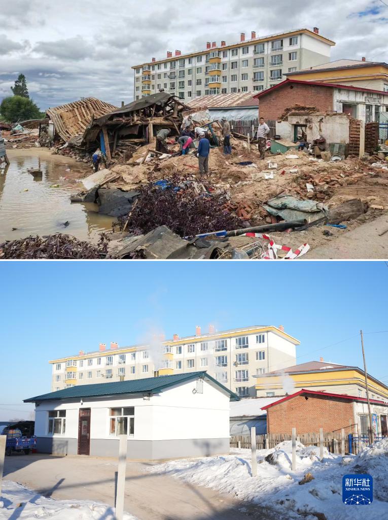 拼版照片:上圖為在黑龍江省尚志市老街基鄉基豐村,村民劉環茂家的房屋被洪水衝垮(8月5日攝)。新華社發(任春艷 攝);下圖為12月12日,在黑龍江省尚志市老街基鄉基豐村,村民劉環茂家的房屋已新建完成。新華社記者 謝劍飛 攝