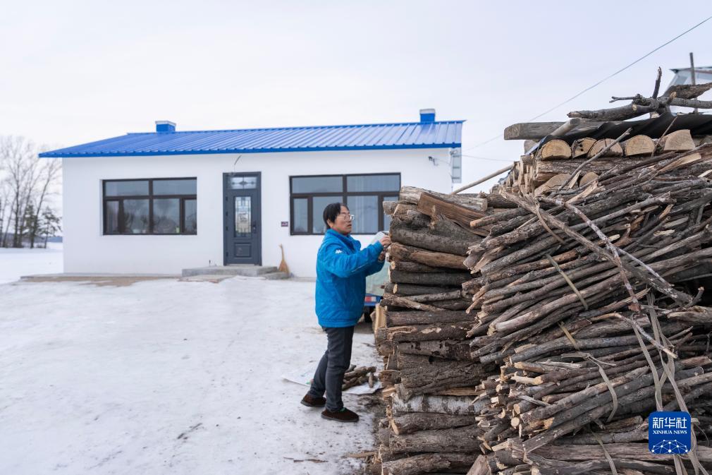 12月11日,在黑龍江省尚志市老街基鄉龍王廟村,村民車喜華在新建成的房屋外取木柴。