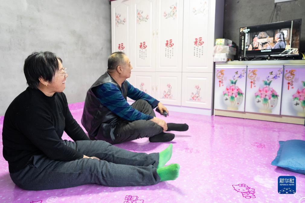 12月11日,在黑龍江省尚志市老街基鄉龍王廟村,村民趙志山(右)、車喜華夫婦在新建成的房屋裏看電視。