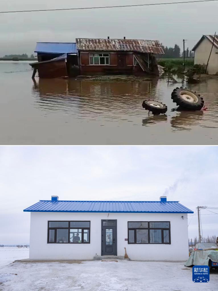 拼版照片:上圖為黑龍江省尚志市老街基鄉龍王廟村村民趙志山與車喜華夫婦遭受洪澇災害的房屋(8月3日攝)。新華社發(任春艷 攝);下圖為黑龍江省尚志市老街基鄉龍王廟村村民趙志山與車喜華夫婦新建成的房屋(12月11日攝)。新華社記者 謝劍飛 攝
