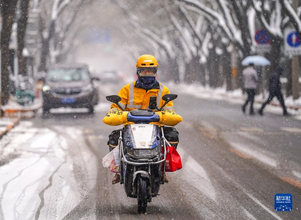 12月13日,一位外賣送餐員冒雪騎行在北京羊坊店西路上。