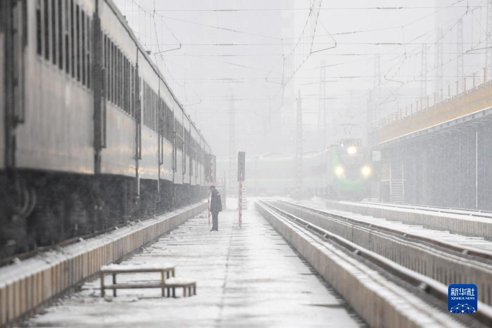 12月13日,在中國鐵路北京局集團有限公司北京車輛段,檢修人員在冒雪檢修入庫列車。