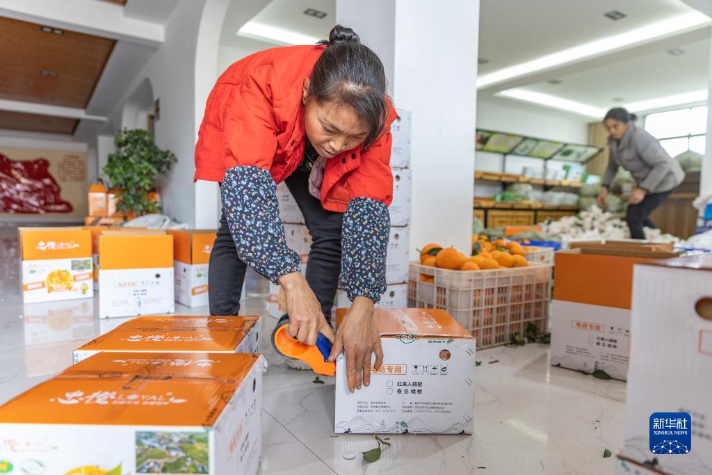 12月12日,在重慶市忠縣新立鎮桂花村,村民將採摘回來的愛媛橙打包裝箱。