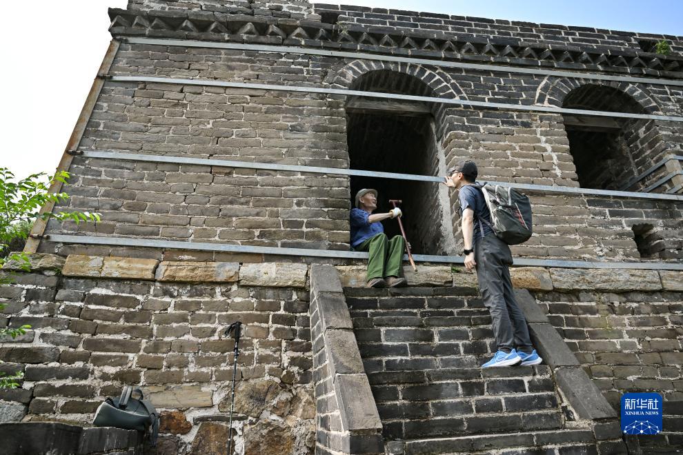 在北京延慶的長城花家窯子段,嚴欣強(左)和嚴共明考察一座經修復加固後的敵樓(9月5日攝)。