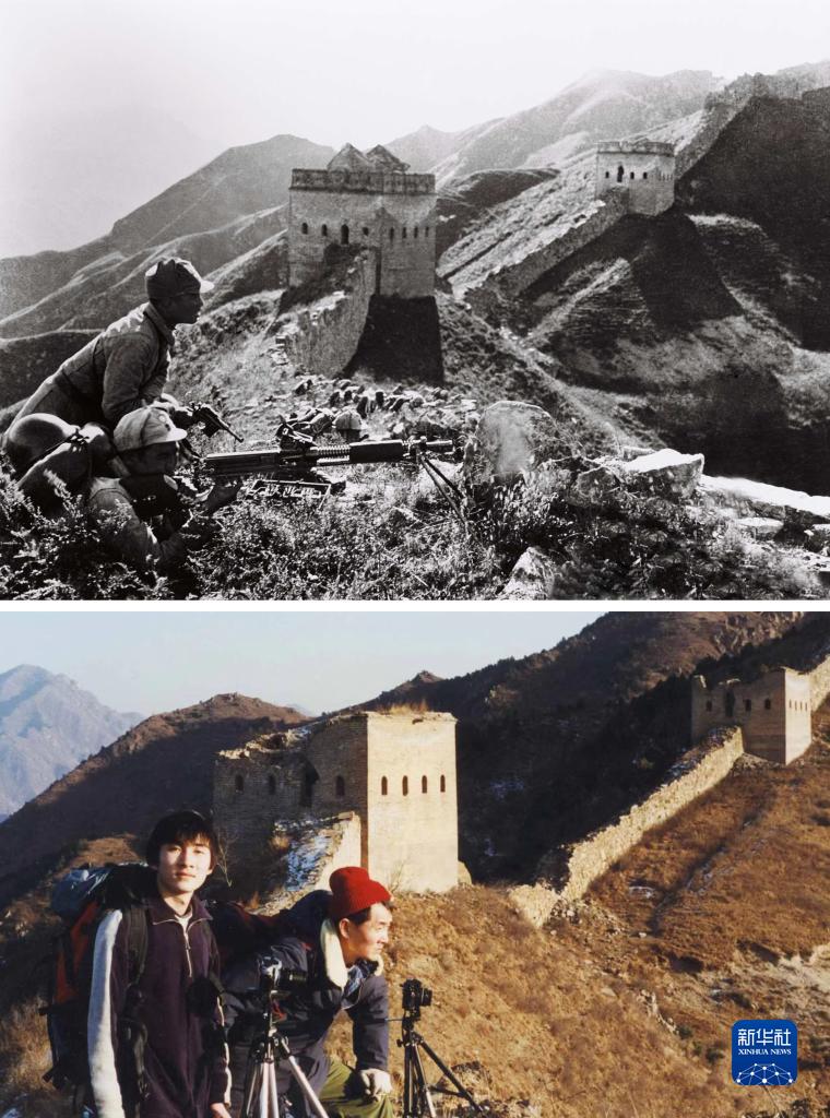 這是一張拼版照片:上圖為革命攝影家沙飛的作品《戰鬥在古長城》(資料照片);下圖為嚴氏父子依照長城形態等線索,找到了《戰鬥在古長城》的拍攝地河北省淶源縣浮圖峪長城(1997年2月7日攝)。