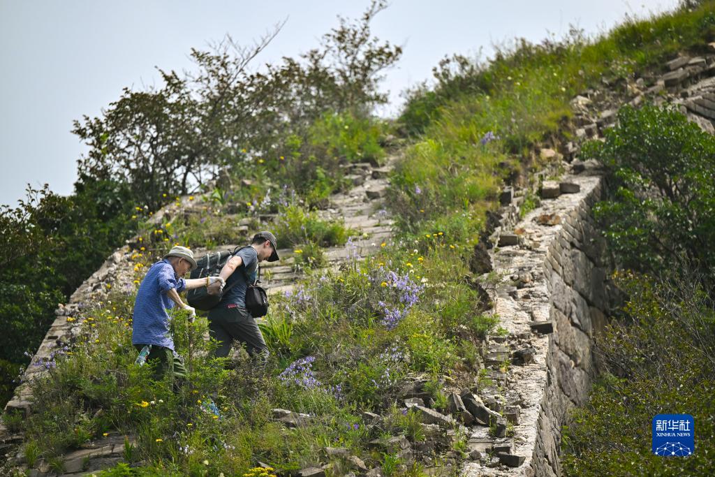 嚴共明(右)拉着嚴欣強行走在北京延慶的長城花家窯子段(9月5日攝)。
