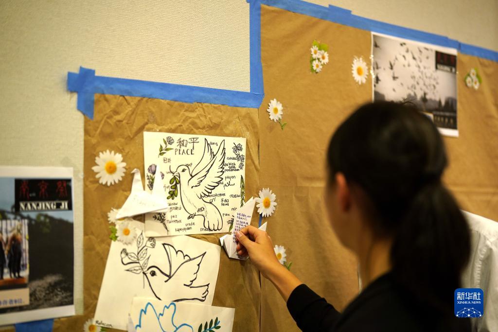 12月10日,一名參與者在美國舊金山舉行的“南京祭”活動上張貼以和平鴿為主題的祈願寄語。