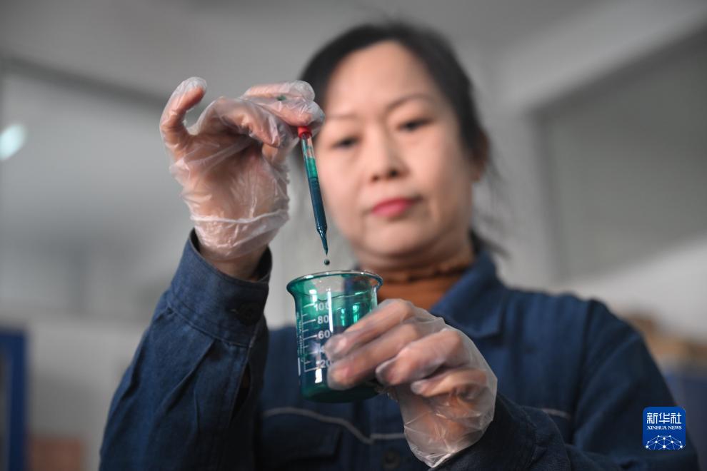 12月12日,在天津市鴕鳥墨水有限公司研發部,工作人員在進行新色配方試驗。