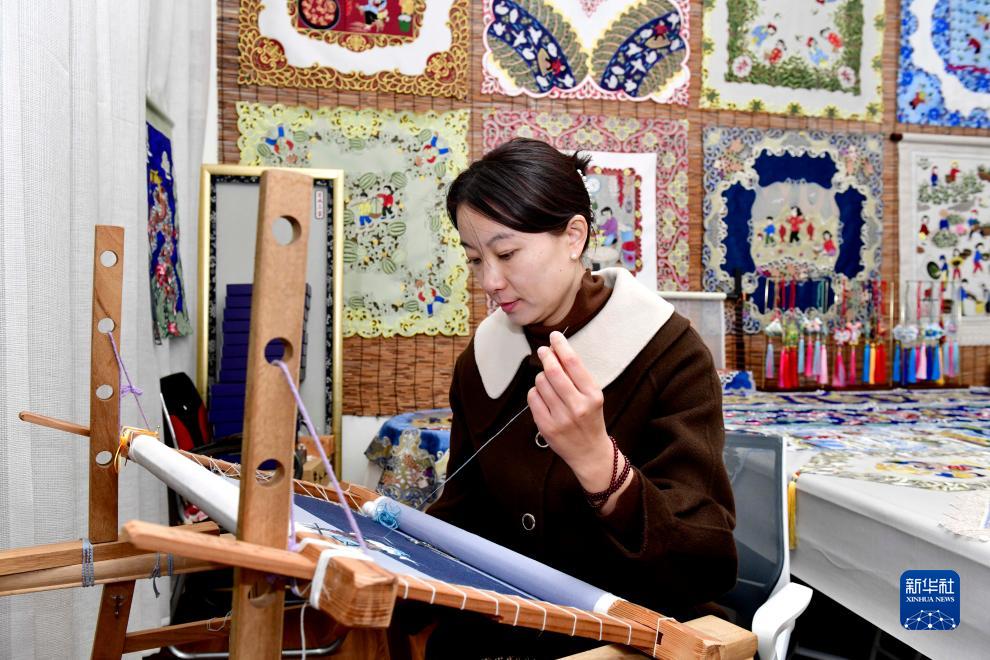 12月13日,在日照市刺繡非遺工坊,非遺傳承人李兆梅在創作刺繡作品。