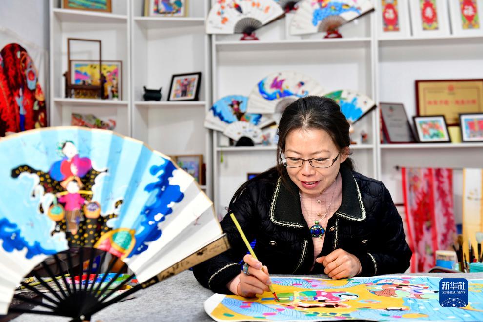 12月13日,在日照市農民畫非遺工坊,非遺傳承人喬諾在創作農民畫。