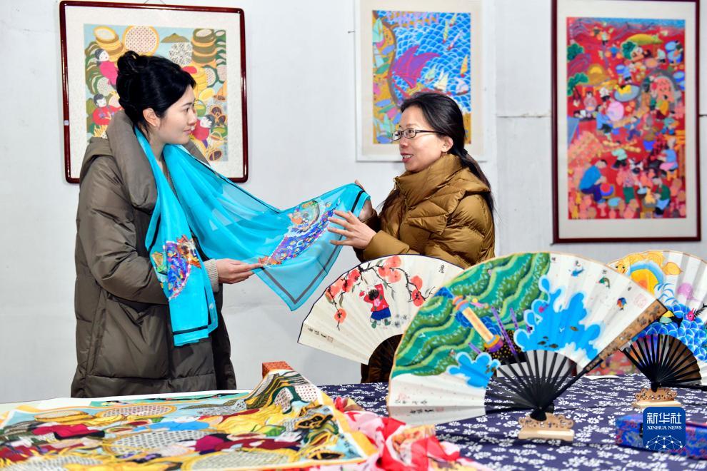 12月13日,在日照市農民畫非遺工坊,非遺傳承人喬諾(右)在介紹農民畫衍生文創産品。