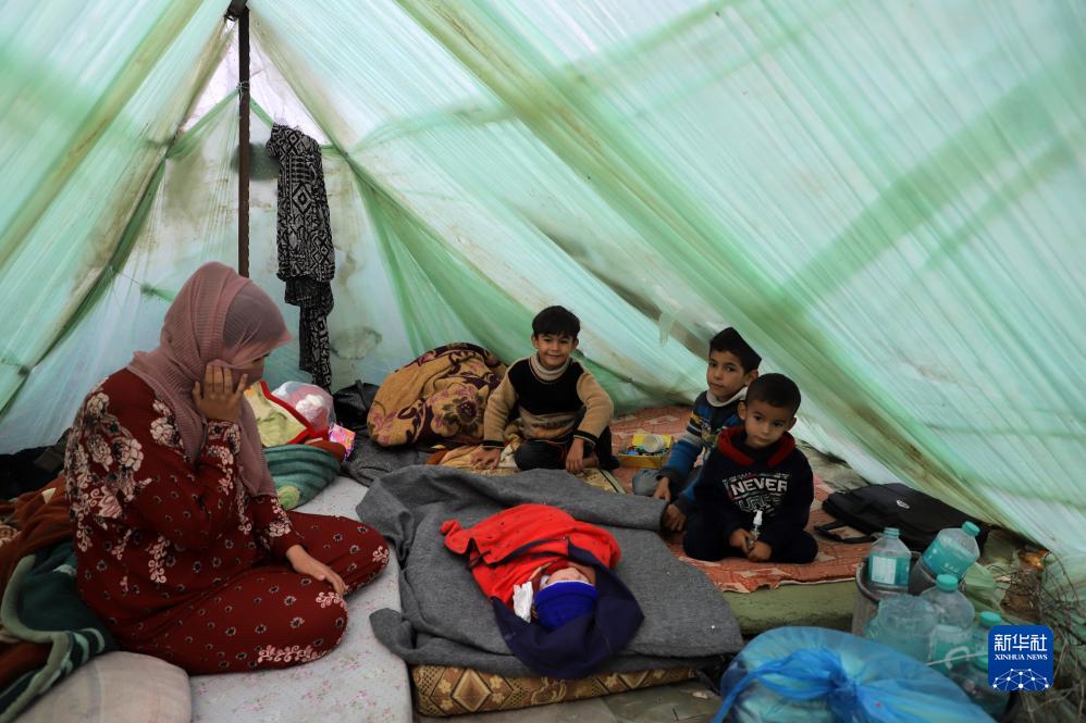 這是12月13日在加沙地帶南部城市汗尤尼斯一處臨時營地拍攝的巴勒斯坦兒童。