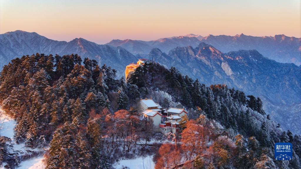 12月12日拍攝的雪後華山南峰和金天宮(無人機照片) 。