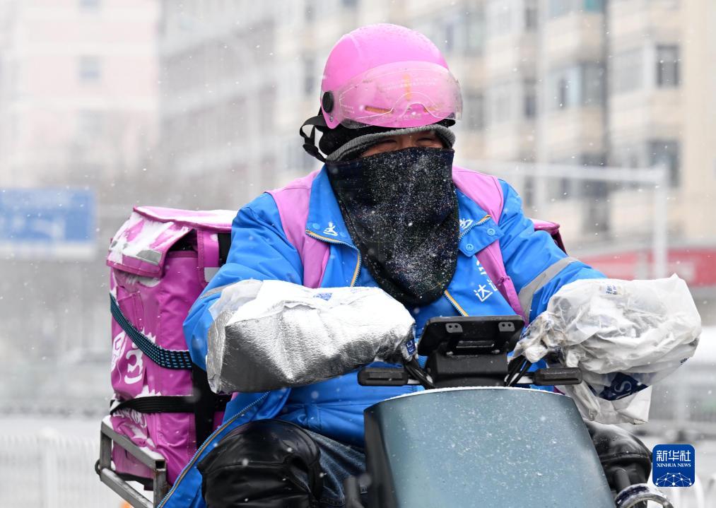 12月13日,在天津市南開區,一名外賣騎手身着禦寒裝備在騎行途中。