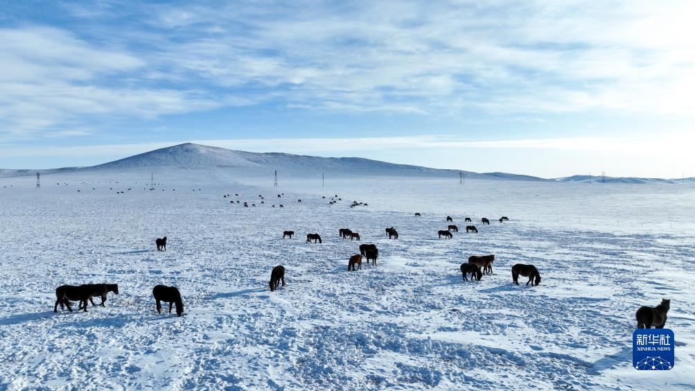 12月13日,馬群在錫林郭勒草原上覓食(無人機照片)。