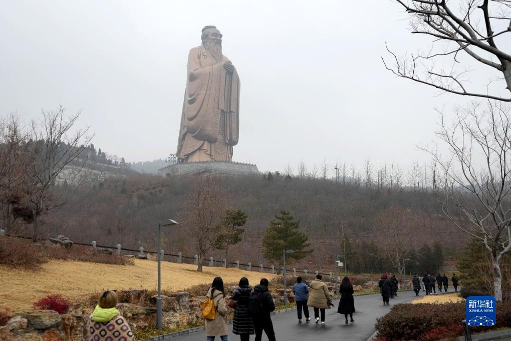 游客從“尼山聖境”景區高72米的孔子像下走過(12月13日攝)。