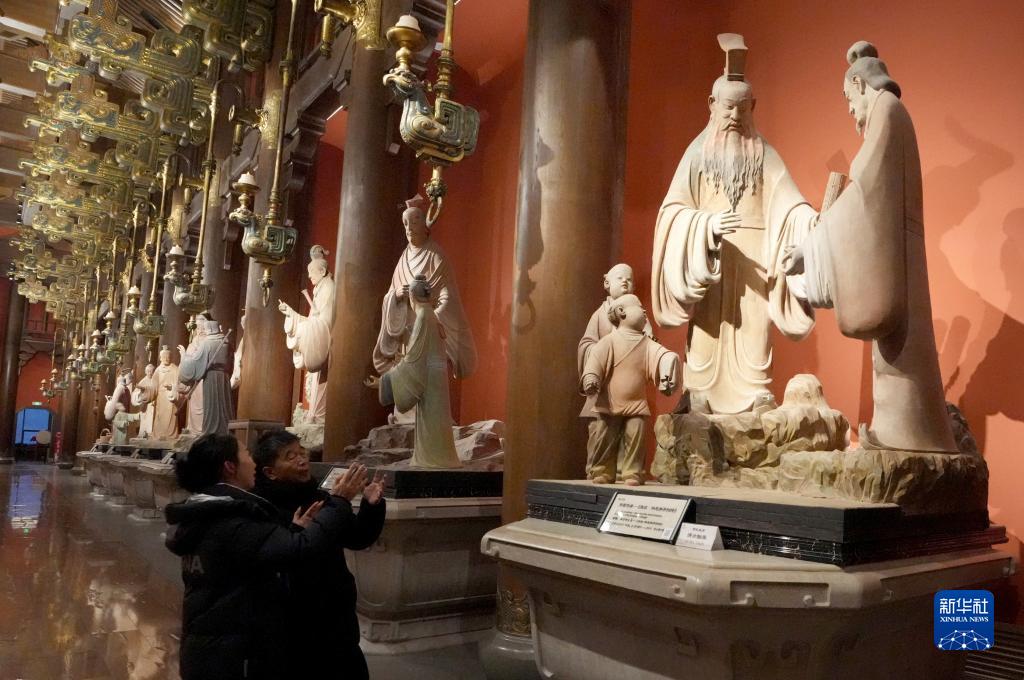 游客在曲阜“尼山聖境”參觀七十二賢廊裏的雕塑(12月13日攝)。