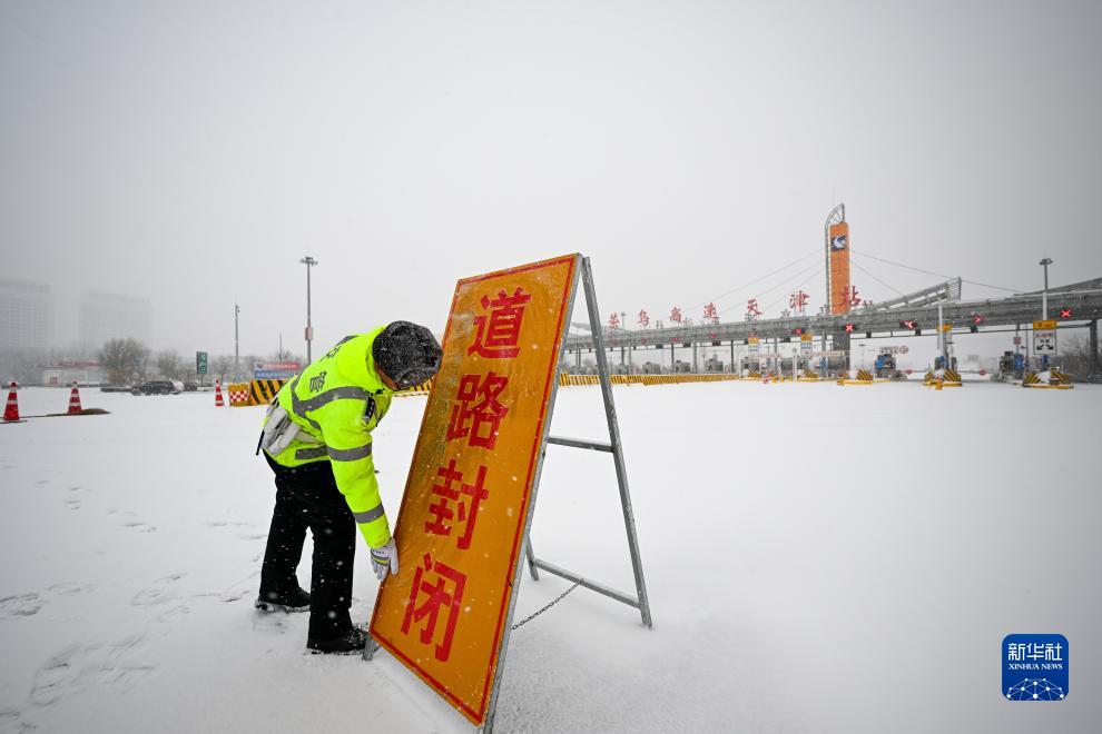 12月14日,在榮烏高速天津收費站,民警擺放高速道路封閉提示牌。