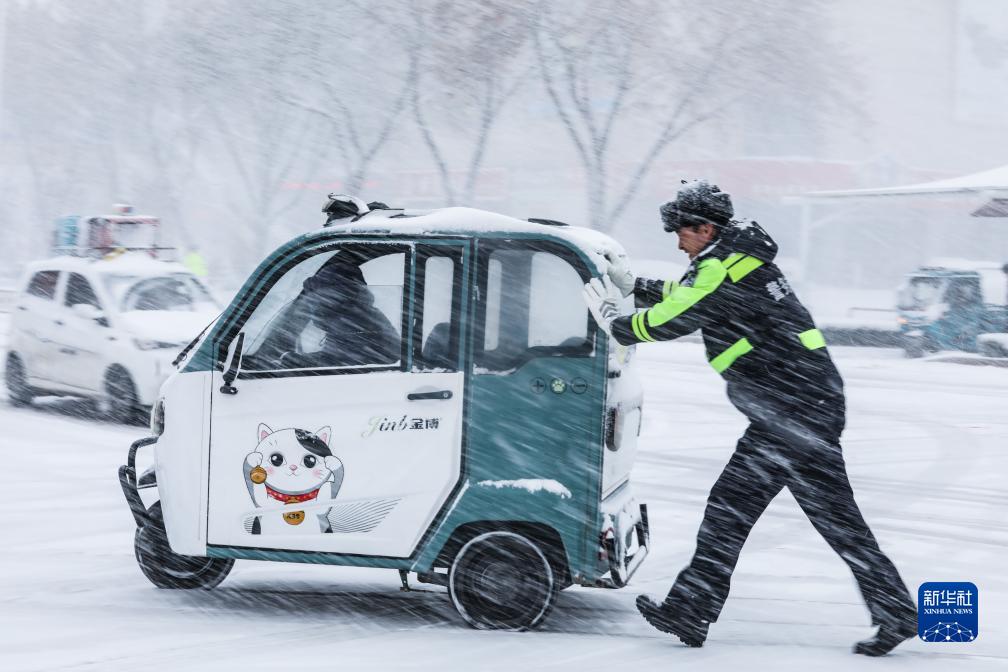 12月14日,在山東省樂陵市街頭,交警冒雪幫助群眾推車。