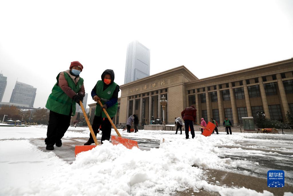 12月14日,園林工人在河北省石家莊市文化廣場清掃積雪。