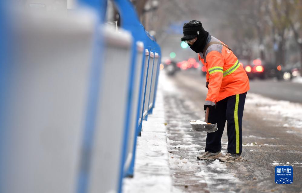 12月14日,河北省石家莊市長安區環衛工在道路上清掃積雪。