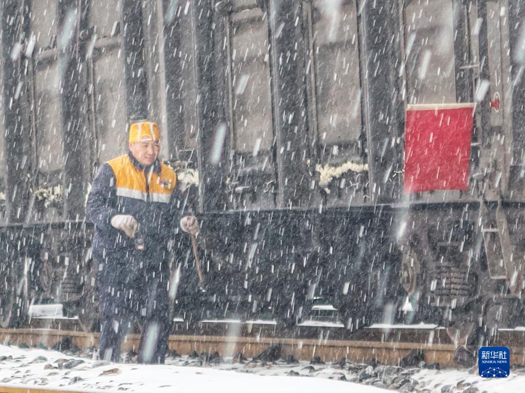 12月14日,中國鐵路鄭州局集團公司車輛系統職工冒雪檢修列車。