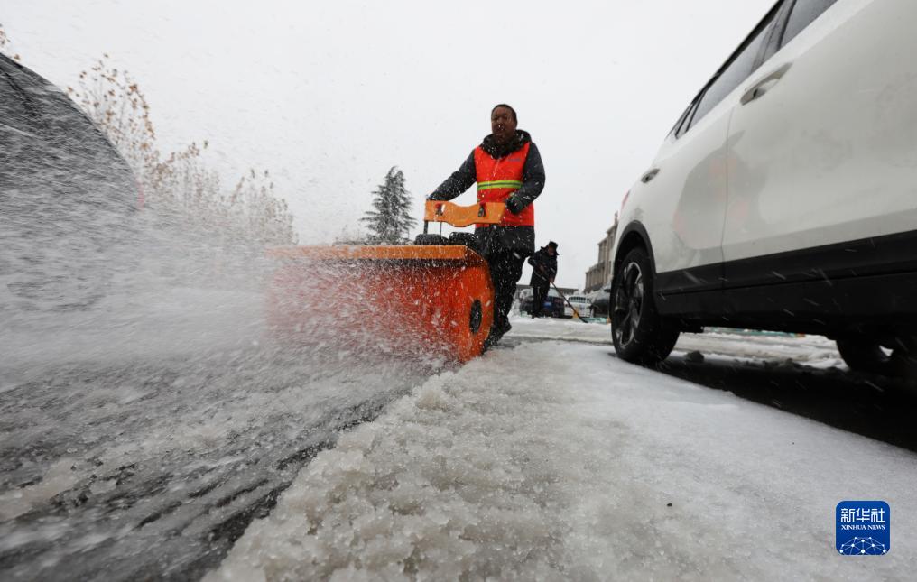 12月14日,在河南省武陟縣一處停車場,環衛工人在清除積雪。