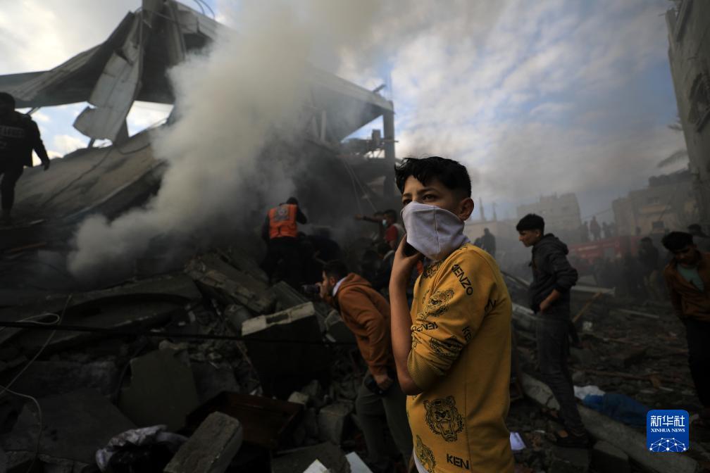 12月14日,在加沙地帶南部城市拉法,人們在以軍空襲後的建築廢墟上開展救援。