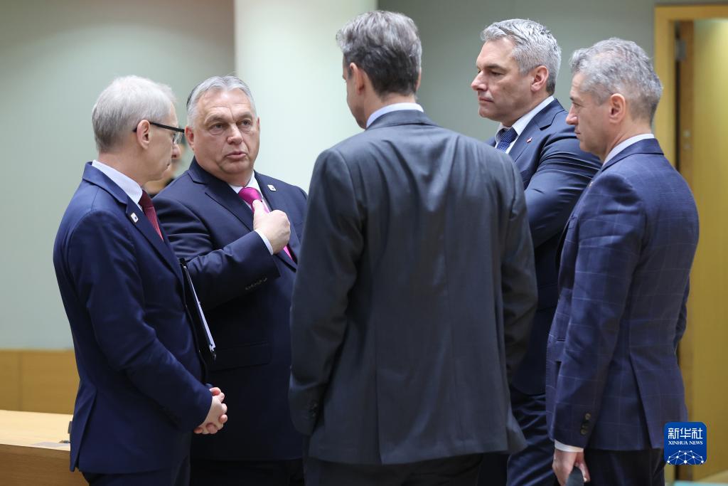 12月14日,匈牙利總理歐爾班(左二)在比利時布魯塞爾出席歐盟峰會期間同其他與會領導人交談。