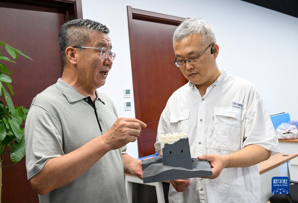 李哲(右)與天津大學長城研究團隊負責人張玉坤在辦公室內手拿一座3D打印的長城敵樓模型交談(7月25日攝)。