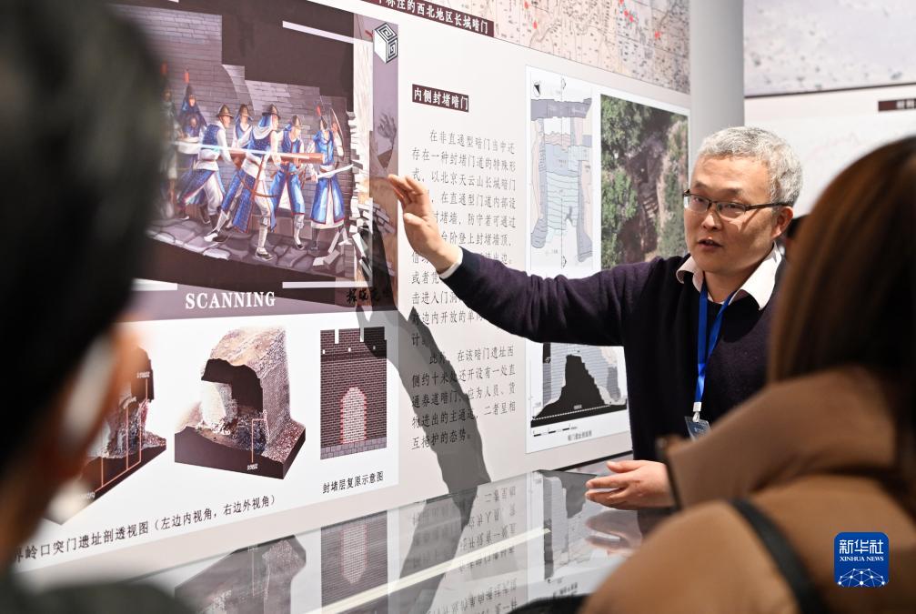 李哲(右二)在“虛實之間·發現長城——天津大學長城研究和數字成果展”上給觀眾講解長城突門(2月12日攝)。