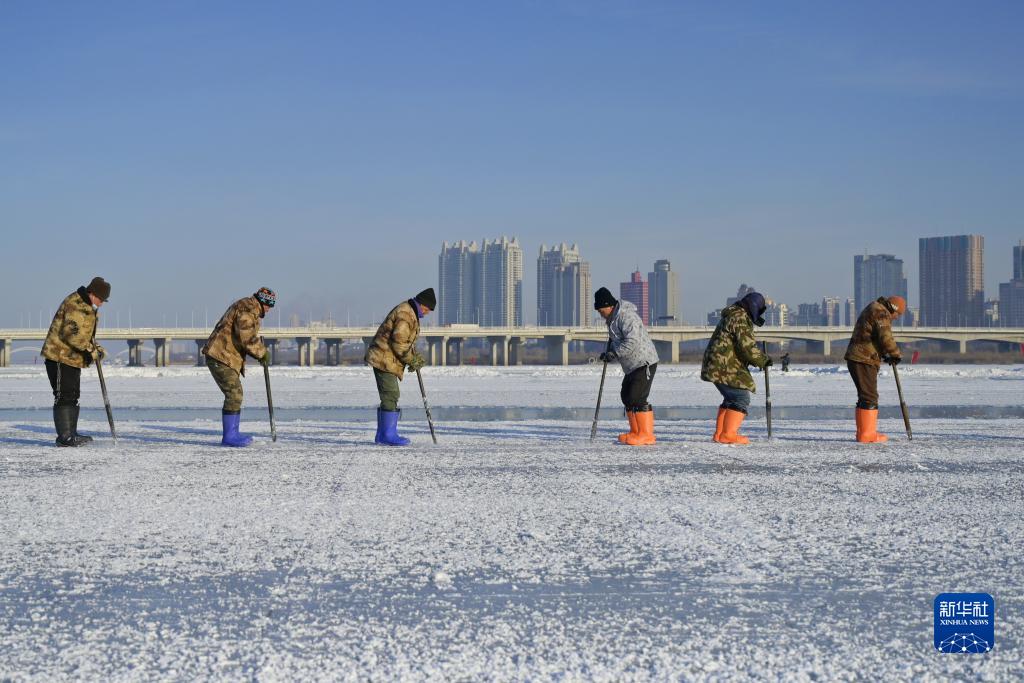 12月14日,工人在封凍的松花江哈爾濱段江面採冰。